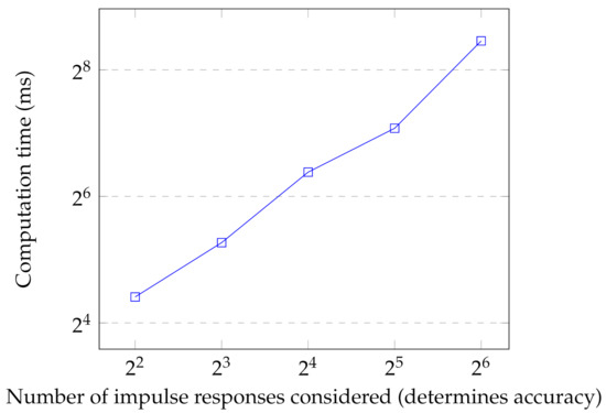 In our tests we have found a good balance to be , in this case impulse responses (top right image), as for several images we have obtained PSNR of around 30 dB, independently of N, with that trade-off ( instead of ). The execution times are presented in Figure 13. Notice that both axes are on log 2 scale.