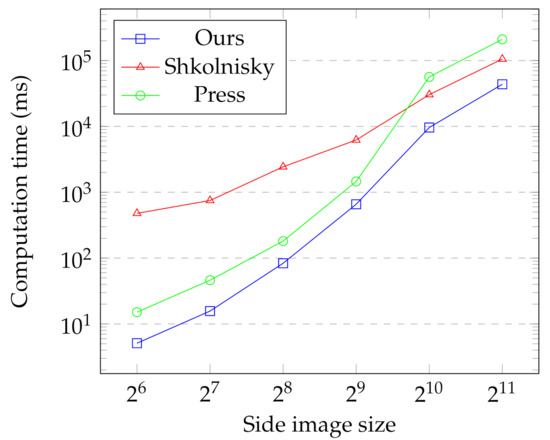 Figure 14 shows the comparison between the different algorithms. For every image side size in the comparison, from 64 to 2048, our proposed method is systematically faster than the other two methods. The speedup is approximately in comparison with the second fastest method. But depending on the size and method with which we confront it, the speedup can be more than ten times greater.