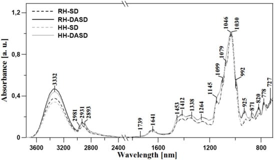 The location of the maxima of absorption bands FTIR with the arrangement of appropriate vibration for selected for sampling: RH-SD, RH-DASD, HH-SD, HH-DASD made in terms of spectral 3750–690 cm−1.