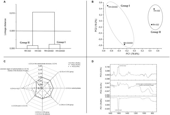 (A)—Hierarchical cluster dendrogram constructed from the FTIR data for powders. (B)—The scores plot of PCA (PC1xPC2) based on FTIR spectra of powders. (C)—Spider web plot of the main type and origin of vibrations FTIR spectra in the terms of principal components PC1, PC2, PC3 for powders. (D)—The loading factors of PCA. RH-SD, RH-DASD, HH-SD, HH-DASD powders.