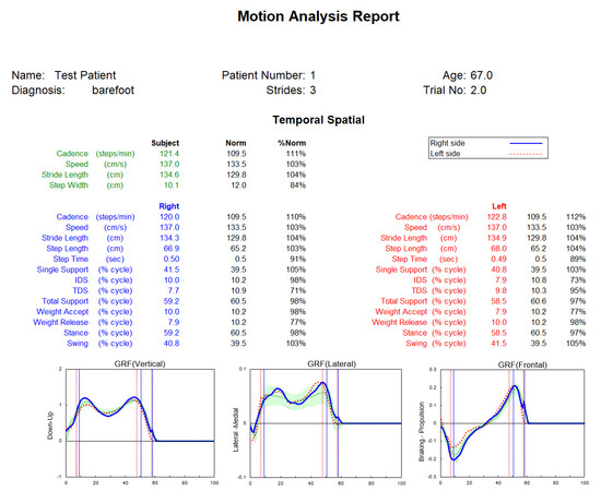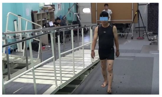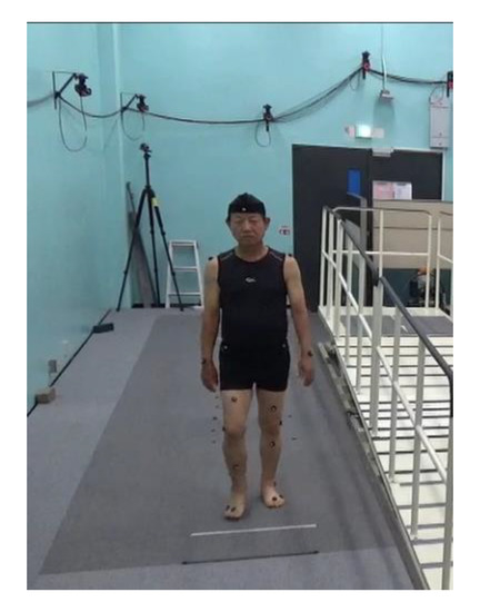 Figure 7) in a manner that allowed adaptation to the clothes worn, the marker set and the measuring environment in order to minimize the errors attributable to such factors. For normal walking, the activity was carried out on a 6 m long walkway, and at this time, a comfortable environment was ensured to the best possible extent so that the usual walking characteristics could be obtained. For maximum walk, an instruction stating that a special situation (ending of traffic time during walking on a crosswalk, etc.) has occurred was given after completion of the normal walk. The testers were told to walk fast accordingly, and the walking characteristics were measured.