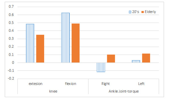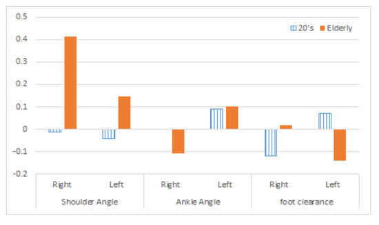 Figure 11, the biggest difference in balance factors was confirmed. It is a fact that everyone knows that balance factors must be strengthened to prevent and reduce fall accidents. Regardless of the causal relationship, according to the results of this study, the balance factors show a large difference between the general and the elderly, along with ankle joint-torque and shoulder angle. In other words, it means that elderly people with poor balance ability have weak ankle strength and the faster the upper body moves, the less. In order to overcome this, it is necessary to be able to maintain the angle of the ankle higher than the floor surface like the general public through the strengthening of the lower limb muscle strength. Strengthening the ankle may require strengthening the muscles of the calf and thigh, the entire lower extremity connected to it. Along with this, you need to strengthen the movement of your upper body to gain momentum by waving your arms, and to balance the left and right. If this type of management and exercise are carried out together, it is expected that the elderly will be able to strengthen their bodies in a form closer to the general public in the absence of a balance factor as shown in this study.