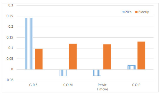 In the case of ordinary individuals, the fluctuation observed in the balance factor during normal walking and maximum walking was not large. In order to improve walking speed, the GRF increased, but other body balance factors slightly increased or decreased. This is a result of the movement of the extremities of ordinary individuals increasing in order to enhance the walking speed, even though the movements of other parts did not experience any pronounced or minor changes. As shown in