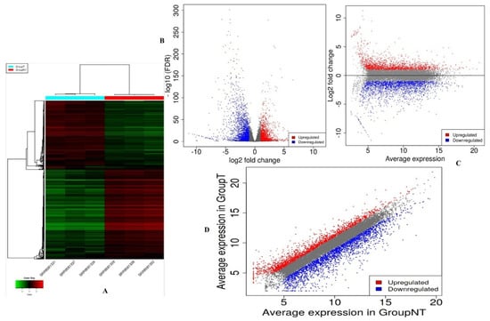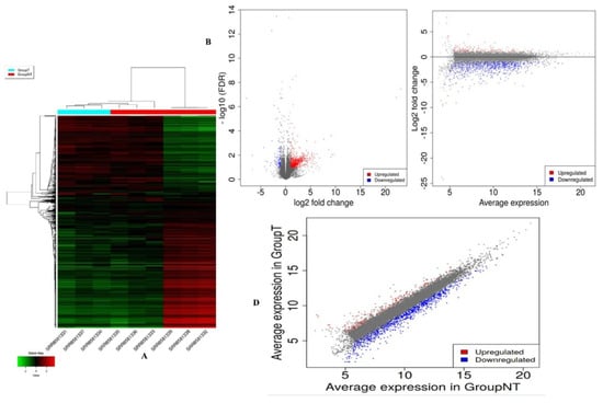 The alignment was used to assemble the transcripts through StringTie, which also calculates the read counts and fragment per kilobase of transcript per million map reads (FPKM) value corresponding to every assembled gene/transcript. Finally, the count matrix was made from the StringTie output of every sample as count matrix is the recommended input for the differential-expression analysis []. The read count matrix of comparison-I and comparison-II had six samples and nine samples, respectively, which were used for further analysis in iDEP 9.1. In expression analysis, genes with 0.5 minimal counts per million (CPM) in at least one library were selected and taken for the clustering and heatmap analysis. Heatmaps were generated using 1000 most differentially expressed genes in both the comparisons (comparison-I and comparison-II). Hierarchical clustering within the heatmaps clustered the PTG and PNTG groups in separate clusters in both the comparisons (Figure 2 and Figure 3). In differential expression analysis, a total of 1951 and 130 genes were found to be up-regulated in comparison-I and comparison-II, respectively (Table D1 and Table D2). Similarly, 2396 and 859 genes were found to be down-regulated in comparison-I and comparison-II, respectively (Table D1 and Table D2). Different plots such as MA plot, volcano plot and scattered plot were also constructed from the DEGs in both the comparisons (Figure 2 and Figure 3).