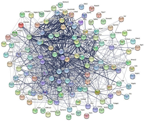 In protein–protein interaction analysis a total of 1065 connections (edges) were found between all 125 nodes (Figure 6) with an average degree of node 17 and PPI enrichment p-value < 1.0 × 10−16. The KEGG pathway enrichment analysis calculated a total of 53 pathway matches in Mus musculus (Figure 6 and Table S6). Most of the pathways were associated with immune-related functions as expected. Surprisingly, however, 3 pathways, i.e., transcriptional misregulation in cancer (mmu05202), pathways in cancer (mmu05200) and proteoglycans in cancer (mmu05205), were associated with cancer (Table S7). A total of 16 genes (Bcl2a1b, Bcl2a1d, Cd44, Csf1r, Csf2ra, Cxcr4, Fn1, Fos, Hmox1, Il7r, Itgam, Lpar5, Mmp2, Pak1, Rac2 and Tlr2) among 125 immune-suppressor genes were found to be associated with these cancer-related pathways (Table S7).