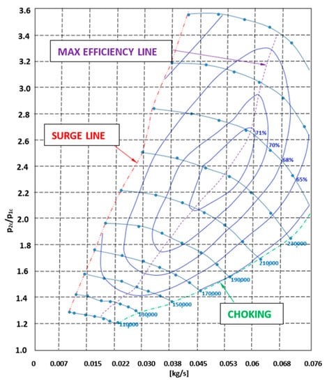Since the vehicle displacement and power (998 CC) are assigned, the natural choice is to use (and possibly slightly reconfigure) the compressor currently installed, i.e., the Garrett GT12 model, whose operational map is shown in Figure 1. In view of the modifications implemented on the compressor geometry and briefly described below, it is useful to summarize here the conceptual design procedure [5,6,7,8,9]: