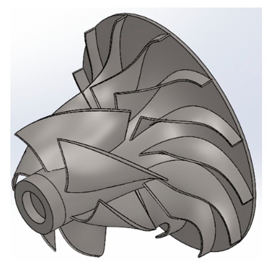 The next step is to perform a preliminary design of the stage, i.e., to define all of its dimensions and shape ratios, choosing the materials and proceeding to a final design [10,11,12]. In our case, it was decided to modify the compressor design adopting a tandem configuration (Figure 2) consisting of an axial inducer followed by a radial exducer, maintaining the same inlet and outlet section diameters as in the Garrett GT12. The details of the necessary modifications and the DOE-CFD-aided configuration optimization are reported in detail in [13], and only the final results will be presented here. The modified compressor has a higher compression ratio than the original unit with an improved surge margin and a lower sensitivity to choking: its characteristic is shown in Figure 3, together with the corresponding engine operating points. The results of the preliminary design of the compressor are displayed in Table 1.