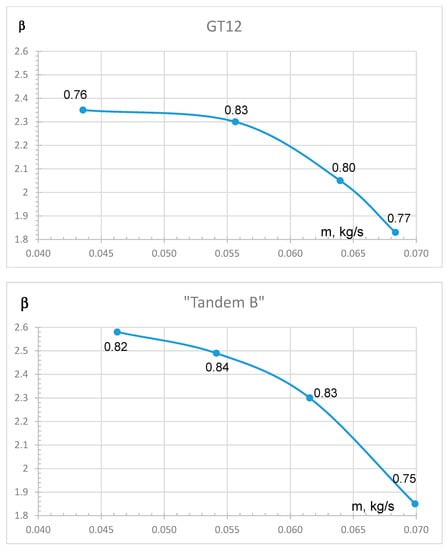 Comparison between the operating lines of the original GT12 compressor and of the redesigned “optimal” configuration (“Tandem B”, adapted from [13]). Both curves are labelled by the TC efficiency.