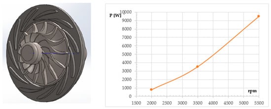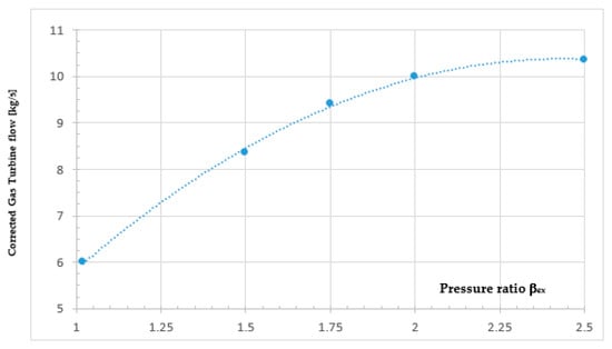 In an electrically coupled turbocharger it is not possible to use the original GT12 component, because its design points depend on the operation of the waste-gate valve, and as such it would not be able to properly respond to the engine conditions nor to supply the required extra power [14,15,16,17,18]. The selection and redesign of the turbine are detailed in a separate work [19], and only a brief summary is repeated here. The selected turbine is a modified Garrett GT20 (operative map in Figure 4), with an accurate redesign of the blade shapes to improve its efficiency and delay choking. In particular, the rotor blade number was increased (14 vs. the original 9), the rotor profile shape and fluid/blade angles were modified, and an 11-blade variable-angle one replaced the original fixed nozzle. The final design and the characteristic curve are shown in Figure 5, and the operating points are displayed in Table 2.