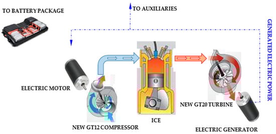 Issues related to the road transportation system and the proposed solutions are currently being debated worldwide. The crux of this debate is whether to shift to electric vehicles (EVs) because of their purported “zero emission capability” and high conversion efficiency, or to devise novel configurations for the gasoline (or diesel or LPG or methane) fueled engines. On the wave of strong subsidies to an “electric transition”, this field is attracting public and private investors, and the market, although still a niche one, is booming: worldwide sales of plug-in cars increased by about 8% in 2018–2019. There are three main types of electric vehicles: battery powered (battery electric or BEVs), ICE-hybrid (HEVs) and fuel cell powered (FCVS) [1,2,3]. Compared to traditional ICE, the propulsion system is fully or partially powered by batteries or smaller ICE or fuel cells, and the traction can be all-electric or mixed (the ICE and the electric motor power separate axles). Advanced electronic equipment is used to monitor and control battery packs, electric motors, power converters, sensors, energy flow management, etc. and has become a key element in the design and implementation of this type of vehicle. The subject of this research is the study and implementation of an innovative supercharger for the ICE (998 cc) of a city car, the Mitsubishi-Smart W451. The design concept is to mechanically disconnect the compressor/turbine unit, powering the compressor with a dedicated electric motor and extracting extra work via a turbine-driven generator. Such a decoupling, currently implemented only on Formula cars and also developed at prototype stage by the Garret corporation [4], allows for both machines to be designed so that they operate very close to their respective maximum efficiency within the expected real operating ranges (dictated by the engine map). Specifically, the turbine is expected to have a lower rotation rate than the original group and will, therefore, be slightly larger. The advantage is that in current supercharged groups the surplus at lower and higher regimes is discharged through the waste-gate valve without expanding in the turbine. In the configuration proposed here, instead, all of the energy of the exhaust gases is exploited by the turbine to generate electrical power that can be channeled into the battery pack. Such a configuration is called a mild hybrid vehicle (MHV).