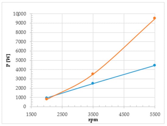 Turbine (orange) and Compressor (blue) power as a function of the ICE rpm.