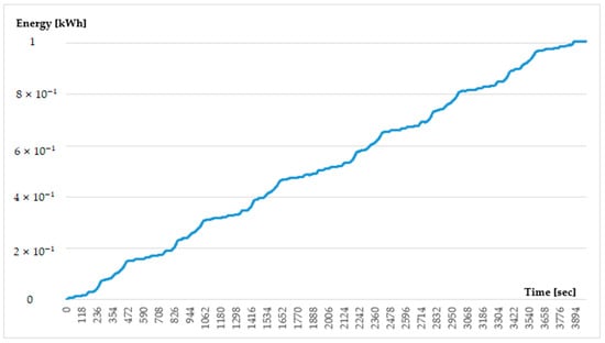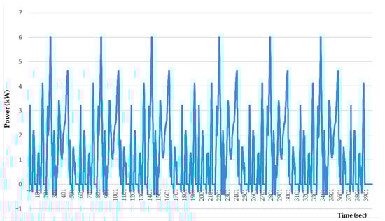Thanks to the above described design modifications, the new turbocharger, operating in the configuration shown in Figure 6, delivers an extra power at all engine regimes, except below about 2500 rpm (Figure 7): notice that the reported values include the mechanical and electrical efficiency and therefore represent net power. For any mission type (in the present study, a local semi-urban city path curve has been used, but the procedure obviously can be adapted to any type of mission, as well as ETC, EUDC, WVU and NEDC [20,21]), the engine energy balance is computed by calculating the instantaneous power request at the wheels [22,23,24], adding the transmission losses and the compressor power and subtracting the turbine power, and taking into account the charging efficiency of the battery pack. The effect of the KERS has not been included in the simulations presented here, because the relevant specifications are not available at the time of this writing. The results of the simulations are shown in Figure 8 and Figure 9. For almost the entire mission, the turbocharger unit is able to deliver net extra power. This power will be used to feed the vehicle auxiliaries (lights, air conditioning, GPS, control panel, console, etc.). Where the power count is negative (almost always in restarts and sometimes during braking), the compressor will draw the required power from the on-board battery pack.