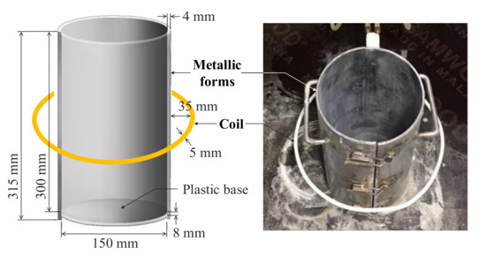 As a first step in the application of an induction heating system for concrete curing, FEM-based thermal analysis was carried out in this study to select the most appropriate materials for fabricating concrete formwork. In the analysis, metallic forms made using three different materials (steel, stainless steel, and aluminum) were heated by induced magnetic field and the maximum temperatures generated in the forms were evaluated. It is well known that the efficiency of an induction heating system is the highest when the system has closed coils because this type of coil is useful for producing a strong magnetic field. Therefore, concrete structures applicable to closed coils, such as columns and piers, were selected. Concrete cylindrical specimens with a diameter and height of 150 mm and 300 mm, respectively, were used to simulate actual columns or piers. Figure 2 illustrates the metallic forms and coil that were simulated in the FEM analysis. The induction coil was designed as a circular tube with outer and inner diameters of 5 mm and 4 mm, respectively, on a copper conductor. The distance between the coil and form was 35 mm, and one-turn coil was applied. A commercial FEM simulator, Altair FLUX, was used to analyze the formwork heating conditions. In the FEM simulation, the convergence criterion was set to 10−4 of accuracy threshold with 100 of maximum iterations for computing the relaxation factor for Newton-Raphson [15].
