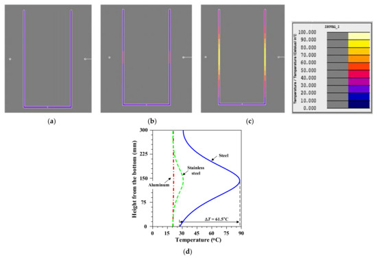 Figure 3 shows the temperature distribution of the inner surface of the forms made from the three different materials (aluminum, stainless steel, and steel), obtained by FEM analysis. The increase in temperature of the formwork was analyzed to select the most appropriate form material. The position of the coil was set at the midpoint of the height of the formwork so that the temperature distribution was symmetrical. It was observed that the maximum temperature of the steel form increased to 89 °C, whereas the temperature of the stainless steel and aluminum forms rarely increased. The general equation for power, P, produced by eddy currents in a conducting mass is: