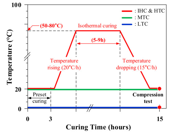(2) Low-temperature curing (LTC): this simulates the cold weather conditions of a typical winter day in Korea. Immediately after casting, all the specimens were stored in the same chamber as that for IHC. However, additional heat curing was not applied. The curing regime for LTC is shown as a blue line in Figure 4. A very low temperature of approximately 0 °C was maintained for 15 h before the compression tests.