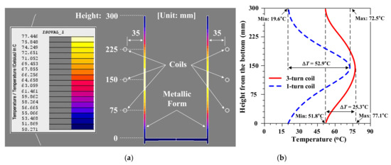 The temperature distribution on the surface of the formwork by a three-turn induction heating coil is shown in Figure 5a. The coil turns were equally spaced with 75 mm intervals, located at 75 mm, 150 mm, and 225 mm from the bottom of the steel form. A temperature of approximately 65–77 °C was distributed from 75 mm to 225 mm, the regions where the coils are located. Furthermore, temperatures at the top and bottom ends of the steel form found to be higher than approximately 50 °C. From the results of the FEM-based thermal analysis, the difference between the maximum and minimum temperatures was over 50 °C when a one-turn induction coil was used, whereas it was reduced to approximately 25 °C when a three-turn induction coil was used (see Figure 5b). In addition, it was confirmed that the temperature uniformity according to the height of the form surface increased further when a three-turn coil was used. This indicated that the use of the three-turn induction coil for concrete curing can yield sufficiently high temperatures above 50 °C as well as increased temperature uniformity along the entire height of the steel form.