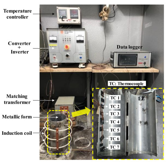 An induction heating system with a maximum output electric power of 7 kWh and resonance frequency of 40 kHz was used for the IHC, as illustrated in Figure 1 and Figure 6. According to the FEM simulations and steel form heating test results described in Section 2, coils having three turns with a distance of 75 mm between coils were applied since this arrangement of coils provided the most uniform temperature distributions along the entire height of the steel form. The temperature hysteresis for IHC, shown in Figure 4, is simulated precisely by a temperature controller that operates based on the proportional integral derivative (PID) method. This system controls the output electric power supplied by the power converter, by considering the difference between the target temperature and the temperature measured using a thermocouple located at the mid-height and inner surface of the form in contact with the concrete. The temperature distributions in the concrete specimens were measured using several thermocouples installed in the concrete. Additional verification of the temperature distribution was performed by photographing the concrete surface and formwork surface with an infrared thermal imaging camera.