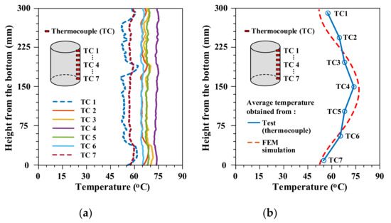 Figure 7a shows the temperature values obtained from each thermocouple attached to the inner surface of the formwork, over a period of 25 min. During the measurement time, the temperature values measured by the thermocouples mostly remain constant. Thermocouples 1 and 7, which were located at the top and bottom ends of the formwork, recorded relatively low temperatures of 51–62 °C and 55–60 °C (dot lines in Figure 7a), respectively. The other thermocouples maintained 65–75 °C (solid lines in Figure 7a). Figure 7b shows the average temperatures measured by each thermocouple, obtained by averaging the data captured during the 25 min in Figure 7a, together with the temperature variation obtained in the FEM simulation (Figure 5b), for comparison. The temperature values measured by thermocouples 2–6 in Figure 7b range from 65 °C to 75 °C. Meanwhile, those measured by thermocouples 1 and 7, which are located at the top and bottom ends of the cylinder, are close to 55 °C and 57 °C, respectively. That is, by comparing the temperature values obtained from the tests and FEM simulations, it was verified that the test results of the induction heating of formwork were highly similar to the results of the FEM-based temperature analysis.