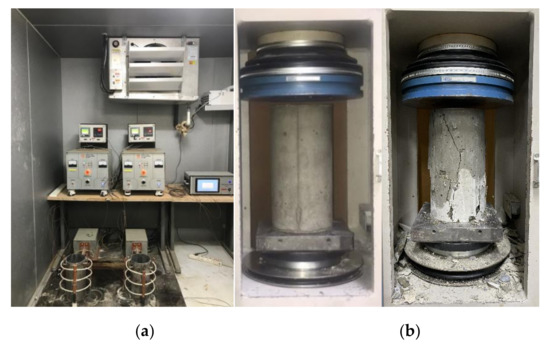 (1) Induction heat curing (IHC): this is considered primarily as a variable in this study. In order to simulate cold weather concrete conditions, concrete specimens were stored in a constant temperature chamber, targeted to maintain 0 °C, immediately after casting. Meanwhile, steel forms containing concrete were heated using an induction heating system according to the temperature hysteresis, specifically the red line in Figure 4. This curing regime comprised 3 h of ambient temperature after casting, followed by a temperature increase at the rate of 20 °C/h up to the maximum temperatures of 50–80 °C. This maximum temperature was maintained for 5 h–9 h and then, the temperature decreased to ambient temperature at the rate of 15 °C/h. After curing was performed at ambient temperature for 15 h, compression tests were carried out to determine the early age strength. Figure 8a shows the test chamber that simulated cold weather conditions (0 °C), test specimens, and setup for IHC.