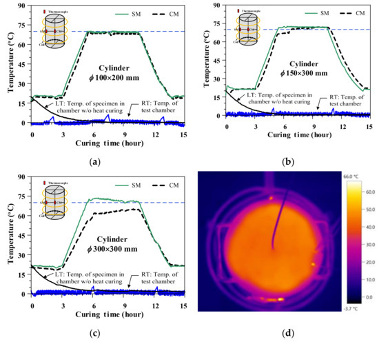 Temperature distributions of the concrete measured during induction heat curing: (a) cylinder with dimensions ϕ100 × 200 mm; (b) cylinder with dimensions ϕ150 × 300 mm; (c) cylinder with dimensions ϕ300 × 300 mm; (d) infrared thermal camera image of the cylinder with ϕ150 mm.