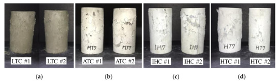Appearance of cylinders after compression tests at 15 h: (a) LTC specimens; (b) ATC specimens; (c) IHC specimens; (d) HTC specimens.