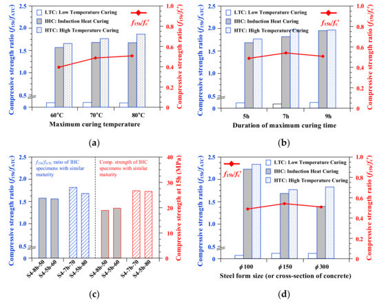 Figure 11b compares the normalized compressive strengths at 15 h obtained by applying varying durations of maximum curing time. It is noted that the maximum curing temperatures for all the specimens in Figure 11b were 70 °C. Both IHC and HTC specimens, which were supplied with additional heat for curing, exhibited higher compressive strength ratios at an early age with increasing the curing period. This result is consistent with the maturity theory, which explains that the strength gain by concrete is a function of time and temperature [2,4]. The maturity of concrete is generally defined as Σ(time interval × temperature). The effects of maturity on concrete strength cured by the induction heating system can be clearly shown by Figure 11c. Each pair of specimens together in Figure 11c have similar maturity (i.e., S4-8h-50 and S4-5h-60 has similar maturity, while S4-7h-70 and S4-5h-80 has similar maturity). The graphs in red on the right-hand side represent the compressive strength values of induction heat-cured concretes at 15 h, while the graphs in blue on the left-hand side represent compressive strength ratios of the same specimens compared with the strength values of the ATC specimens, f15h/fATC. The results of Figure 11c demonstrate that the early age strength of induction heat-cured concrete is proportion to the value of the maturity factor.