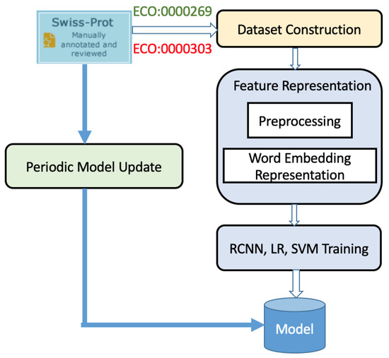 As shown in Figure 1, we extract publications from the Function category of the UniProtKB/Swiss-Prot database, the manually annotated and reviewed section of the UniProt Knowledgebase, during training and then represent these publications using biomedical word embedding of their titles. Afterward, we separately train the logistic regression, SVM with linear kernel, and RCNN models and combine the results to obtain our ensemble learning model. Because new publications are added to the UniProtKB/Swiss-Prot database as they become available, periodic updating of the model can be performed. In Section 2.2, we present the details of our training workflow.