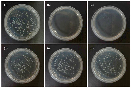 Bacteria colonies of E. coli after exposure to different concentrations of EGCG. (a) 0, (b) 400, (c) 200, (d) 100, (e) 50, and (f) 25 μg/mL.