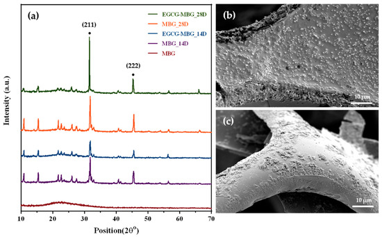The XRD patterns (a) and SEM images of the MBG (b) and EGCG-MBG (c) scaffolds in SBF solution at 28 days.