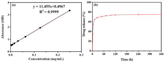 The absorbance value with different EGCG concentration was measured at 274 nm. After calibration, it was noted to have a linear relationship with R2 value of 0.9999 (Figure 6a). The drug release properties of the EGCG-MBG scaffold were monitored through immersion in PBS solution at 37 °C. As shown in Figure 6b, the release rate was high during the initial 24 h. The cumulative drug release rate reached 68.71%. By contrast, the release efficiency was lower and displayed a stable performance. The highest release rate of the EGCG-MBG scaffold was 75.37%. More importantly, the mesoporous structure offered the possibility of maintaining the EGCG concentration at an effective dose for a long time.