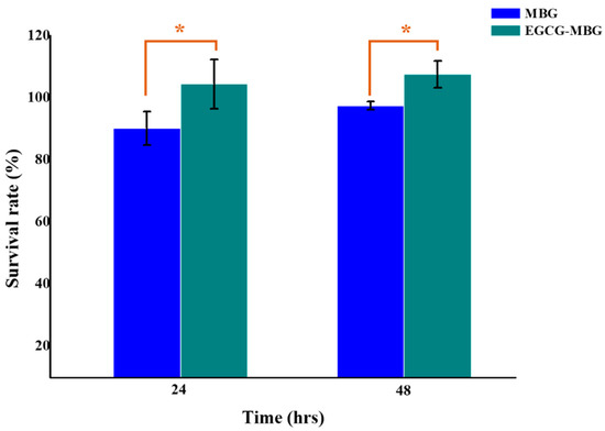 The cytotoxicity of the MBG and EGCG-MBG scaffolds was evaluated by the CCK-8 assay. Figure 7 shows the effect of these scaffolds on cell viability. The survival rate of the MBG scaffold was 90.15% and 97.44% at 24 and 48 h, respectively. Whereas, the EGCG-MBG scaffold displayed a higher proliferation than the MBG scaffold (104.36% and 107.52% for 1 and 2 days, respectively). The cell proliferation results of MG63 behavior showed a significant difference between MBG and EGCG-MBG groups (p < 0.05) [27]. Therefore, the proper concentration of EGCG (200 μg/mL) can prevent cell apoptosis and directly enhance cell proliferation. It could be speculated that the chemical structure of EGCG with MBG scaffolds would remove the free radicals quickly and protect the cell viability.