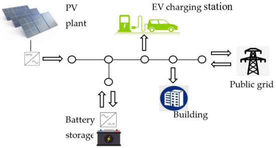 An individual charging system for EVs connected to a public distribution network consisting of a solar power plant and an energy storage system will be analyzed. Through the low voltage AC lines, the vehicle is charged in the following ways: (a) only from the network if there is no production from PV panels, (b) only from PV panels if the production is large enough to cover the load of the individual system and vehicle charging, (c) from the battery if the battery is not charging and is in discharge mode, (d) in parallel from the PV power plant, network, and battery. The principle connection scheme is given in Figure 1. Arrows are indicating the possible power direction.