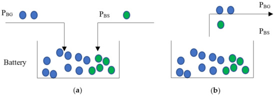 In Equations (1)–(3), the charging/discharging efficiency factor kc/d equals ηc when charging and 1/ηd when discharging the battery. If the total power that discharges the battery is PB, then the power from renewable sources (PBS) and the grid (PBG) are given by Equations (5) and (6), respectively: