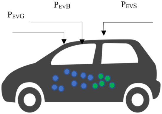 Figure 3 shows the charging process of an electric vehicle. The power is now coming from three different sources (PV, public grid, and battery). Because the battery power can be divided into different sources, EV power contains four components (Equation (7)): power from the PV panel (PS), power from the public grid (PG), battery power originating from the PV panel (PBS), and battery power originating from the grid (PBG).