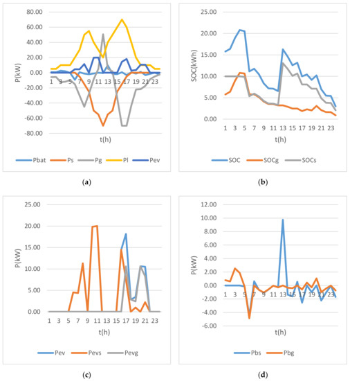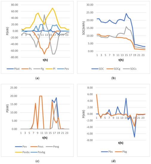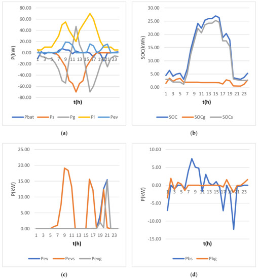 Multicriteria optimization results (a) power flows, (b) SOC of battery, (c) EV charging power, (d) battery charge/discharge schedule.
