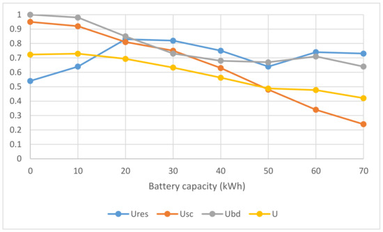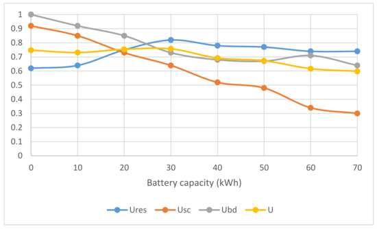 In the second case, the analysis of the change of utility function depending on the battery capacity was performed for the complementary case (20), with the coefficients: k1 = 0.2, k2 = k3 = 0.3; K = 0.3. The results are shown in Figure 9.