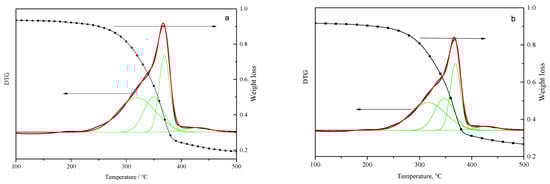 TG and DTG fitting curves between 100–500 °C of pine and mixture: (a) pine and (b) mixture with an aluminum dross to pine mass ratio of 1/4).