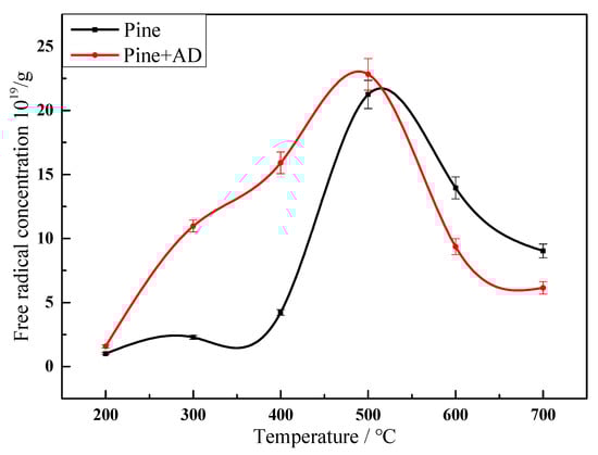 Biomass pyrolysis undergoes an activation process, generation of free radical fragments, and coupling of these radicals. The free radical concentration in biomass pyrolysis residue was about 1019 spins/g and increased to a maximum value of 1020 spins/g at 500 °C during pyrolysis. It is interesting to note that the temperature for maximum free radical concentration was higher than the terminal pyrolysis temperature. Free radical concentration decreased after 500 °C due to condensation reactions where the weight loss reached a plateau, as shown in Figure 2. During the co-pyrolysis of AD and pine, the biomass components, especially hemicellulose, were melted and actively combined by hydrogen bonds with AD at about 300–350 °C. Then, C-C bonds and C-H bonds were activated to form C-O-M (M is the metal) intermediates. The free radicals were trapped in the molten cluster [37]. The weight loss rate was delayed and the area percentage of peak 1 decreased, as shown in Figure 2. The free radical concentration in PADC increased from 2.28 × 1019 to 10.97 × 1019 spins/g at 300 °C, as illustrated in Figure 3. The maximum free radical concentration of 22.82 × 1019 spins/g was reached at 500 °C, correlating to the cleavage of C-O and C-C bonds in C-O-M intermediates; the value was similar to that in pure pine pyrolysis residue. It demonstrates that AD accelerates the free radical generation during pine pyrolysis. The results agree well with the DTG behavior in Figure 2 and Table 2. The areas of peaks 2 and 3 increased with AD addition, demonstrating faster reaction. The free radical coupling reaction was also promoted by AD, indicated by the steeper decline in free radical concentration, as shown in Figure 3.