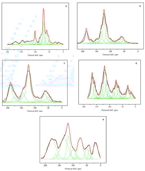 Fitting 13C-NMR curves of samples: (a) pine, (b) PC-500, (c) PC-700, (d) PADC-500, and (e) PADC-700.