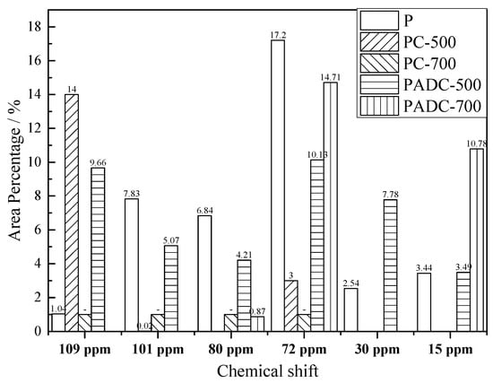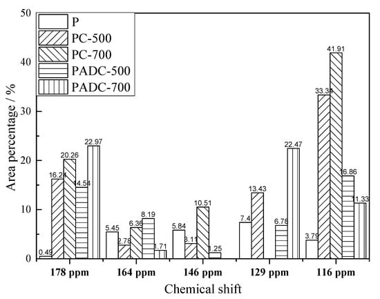 Figure 4a–e shows the curve fitting results of char from pine pyrolysis and co-pyrolysis. The biomass spectrum in Figure 4a has relatively sharp signals at 15–110 ppm due to carbohydrate polymers from the cellulose and hemicellulose, which were facilely broken during primary pyrolysis before 500 °C. With pyrolysis temperature increasing, signals at 110–170 ppm corresponding to the aromatic structure became protuberated and the types of carbon corresponding to the number of sub-curves were fewer. The region at 170–220 ppm contributed by carbonyl groups had a higher intensity in char due to the conjugation of the oxygen functional group to an aromatic structure. When AD was added to pine for co-pyrolysis, the signals at 50–100 ppm were sharp in comparison to char from pine pyrolysis. The carbon types with the oxygen functional group in PADC were more abundant than that in PC. The catalytic pyrolysis with AD generated amounts of active intermediates.