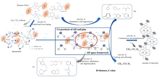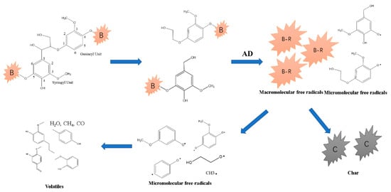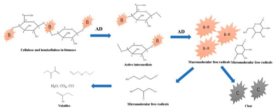 - AD enhances the selective formation of primary tar components such as ketones, furans, and phenols. It accelerates the cleavage of C-O bonds linked with C1 of celluloses and hemicellulose to form ketones and furans. Moreover, AD promotes the formation of phenols via the rupture of the etherified guaiacyl bond and anhydro-oligosaccharide at high temperatures.