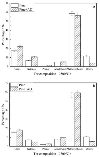 Comparison of the tar composition from the pyrolysis of pine and a mixture at 500 °C and 700 °C: (a) 500 °C and (b) 700 °C.