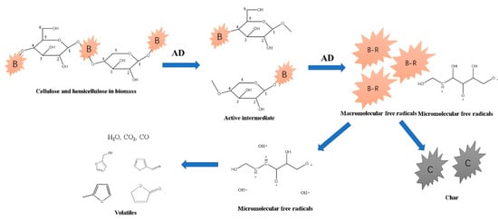 - AD accelerates the cleavage of C-O bonds to form a great amount of free radicals, which are confined in the aggregated structure of AD and biomass during pyrolysis.