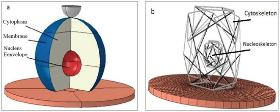 Before meshing the substrate, it was partitioned so that the nodal points of the cytoskeleton tensegrity corresponded to the arrangement of the substrate elements (Figure 3b). Finally, the substrate was meshed by the solid deformable elements. Figure 3 shows the cell structure, location of cell components, and how the cell is attached to the substrate.