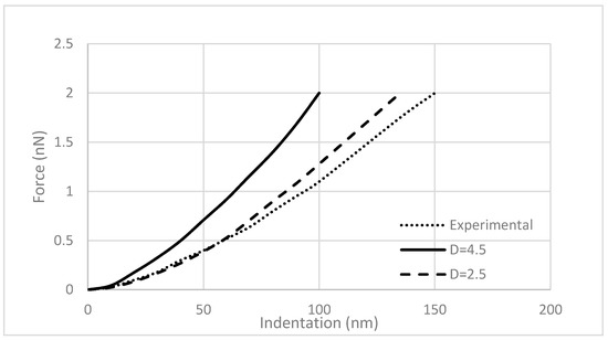 where F is the reaction force, R is the radius of the spherical indenter, δ is the applied indentation, E and ν are the Young’s modulus and Poisson’s ratio of the elastic material, respectively. The power-law fit for the F-δ relationship (Figure 5) obtained in this study was 1.68. This value is very close to the 1.5 that is provided by the theory.