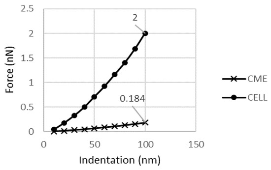 As described above, CSK is the most important cell component due to its contribution to the cell’s mechanical behavior. As can be seen in Figure 11, CSK carries a 1.807 nN reaction force at 100 nm indentation. Thus, relative to the cell response, it carries 90.4% of the cell’s reaction force.
