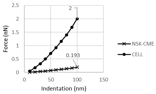 Force-indentation curve for NSK-cytoplasm, membrane, and NE (CME) model vs. the cell.