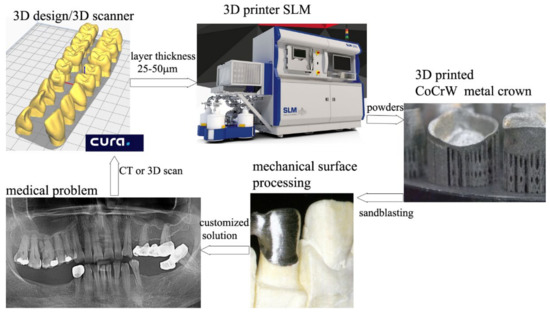 Complex dental problems (determined through computed tomography CT) need new solutions that involve custom items, created via the 3D printing process, in order to obtain specific elements (identified through 3D scanners) (Figure 1). The additive manufacturing technique (i.e., SLM) was used to obtain different samples from Co–Cr–W powders. High-purity metal powders of cobalt, chromium, and tungsten were used for the production through the SLM of the samples. The powder was provided by S&S Scheftner Germany and the 3D printing process was realized using SLM50 equipment (Realizer GmbH, Borchen/ Paderborn, Germany) of the Romanian brand S.C. Lamas Microtech S.R.L. Bucharest.