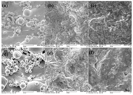 This aspect, i.e., the surface of the material after 3D printing, is important for the selective laser melting process because this technique requires the melting of a powder layer (of a specific thickness) and recoating of this layer with a new one, up to hundreds of layers. The surface parameters of the melted powders must be strictly controlled due to their influence on the particle flux, which affects the laser consolidation [18]. For the semi-melted particles from the surface, a reduction in the number of attached parts of the particles can be observed in the main particles (Figure 2a,d).