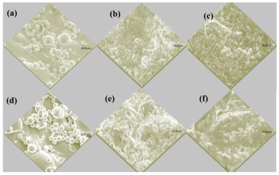 SEM (3D) images of the surface of the 3D printed samples at 1000×: (a) 25 µm—0, (b) 25 µm—1, (c) 25 µm—2, (d) 50 µm—0, (e) 50 µm—1, and (f) 50 µm—2.